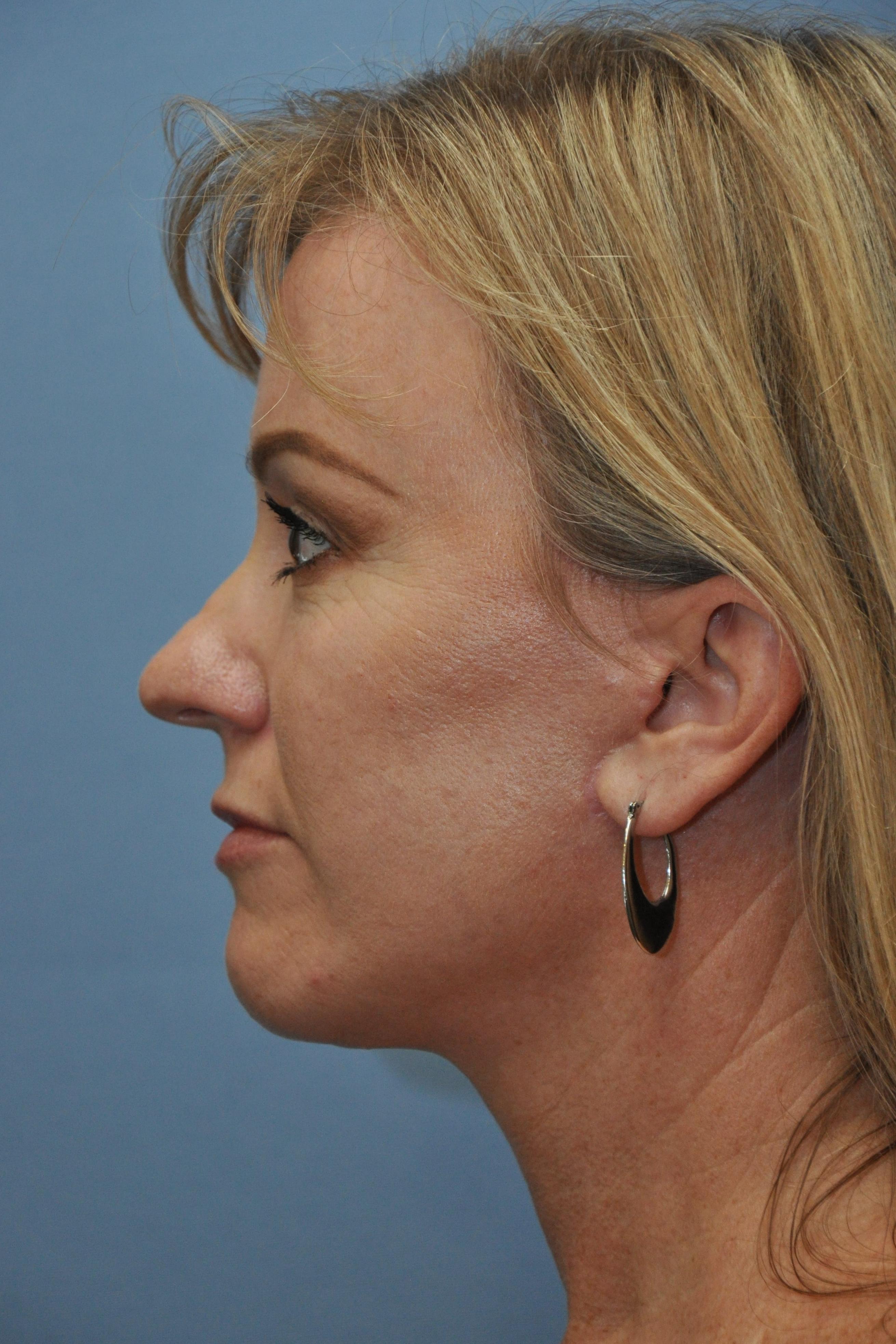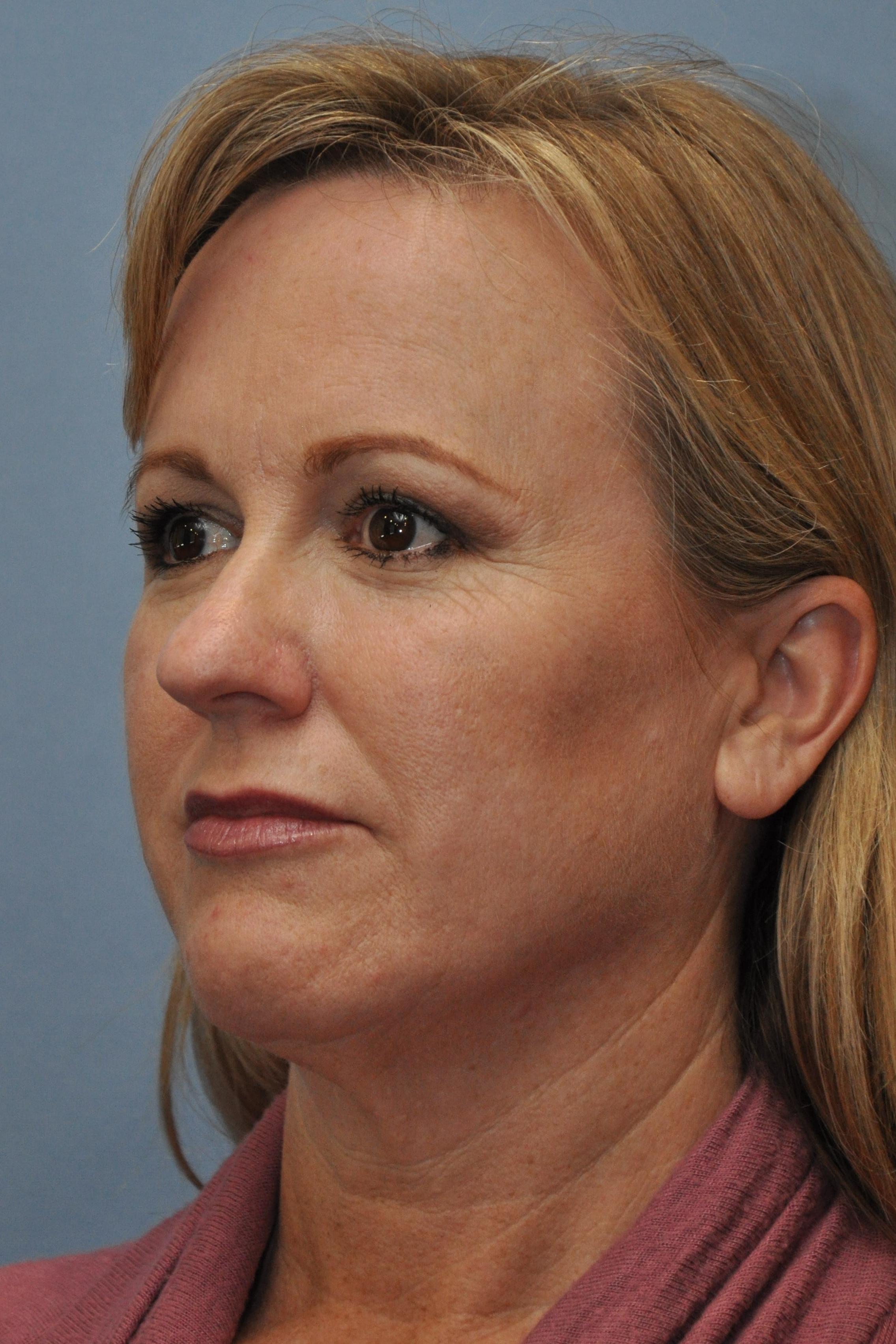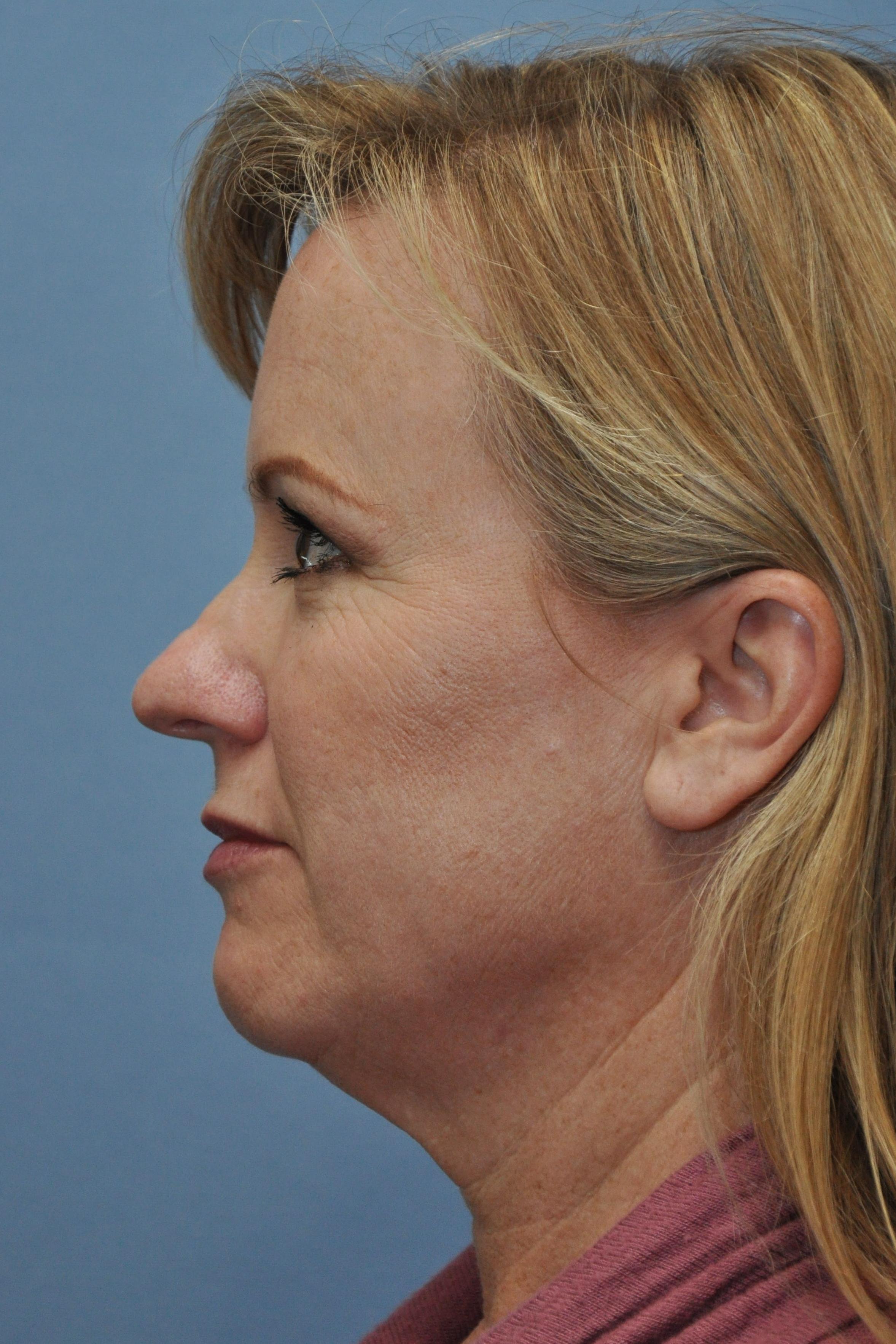 This lovely lady was able to achieve a refreshed appearance, recreating her feminine, slimmer jawline. We reversed the heaviness or square appearance that develops over time. The brows were lifted without shifting the hairline back, but instead shortening the length of the forehead. A facelift can look very natural without a plastic appearance.