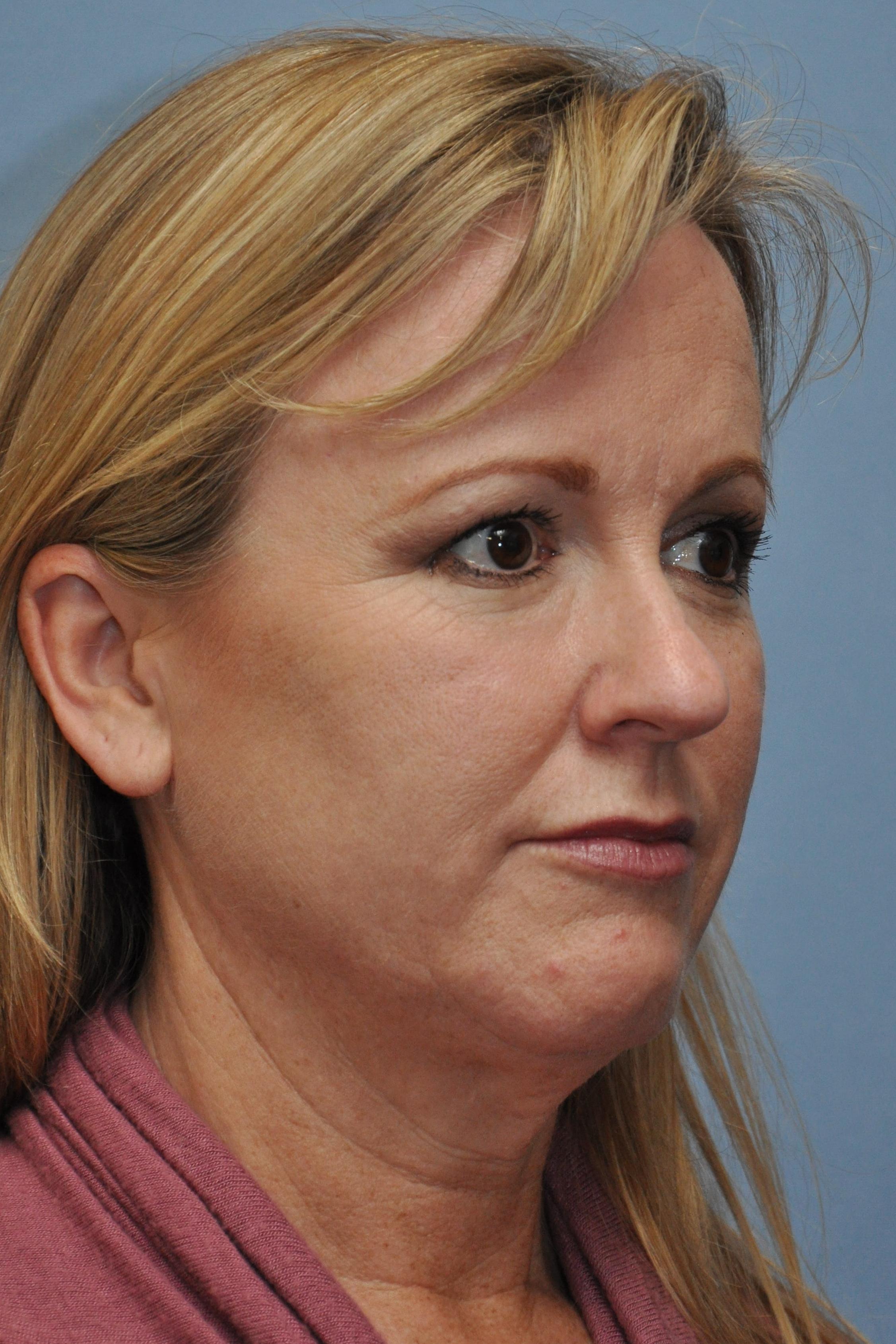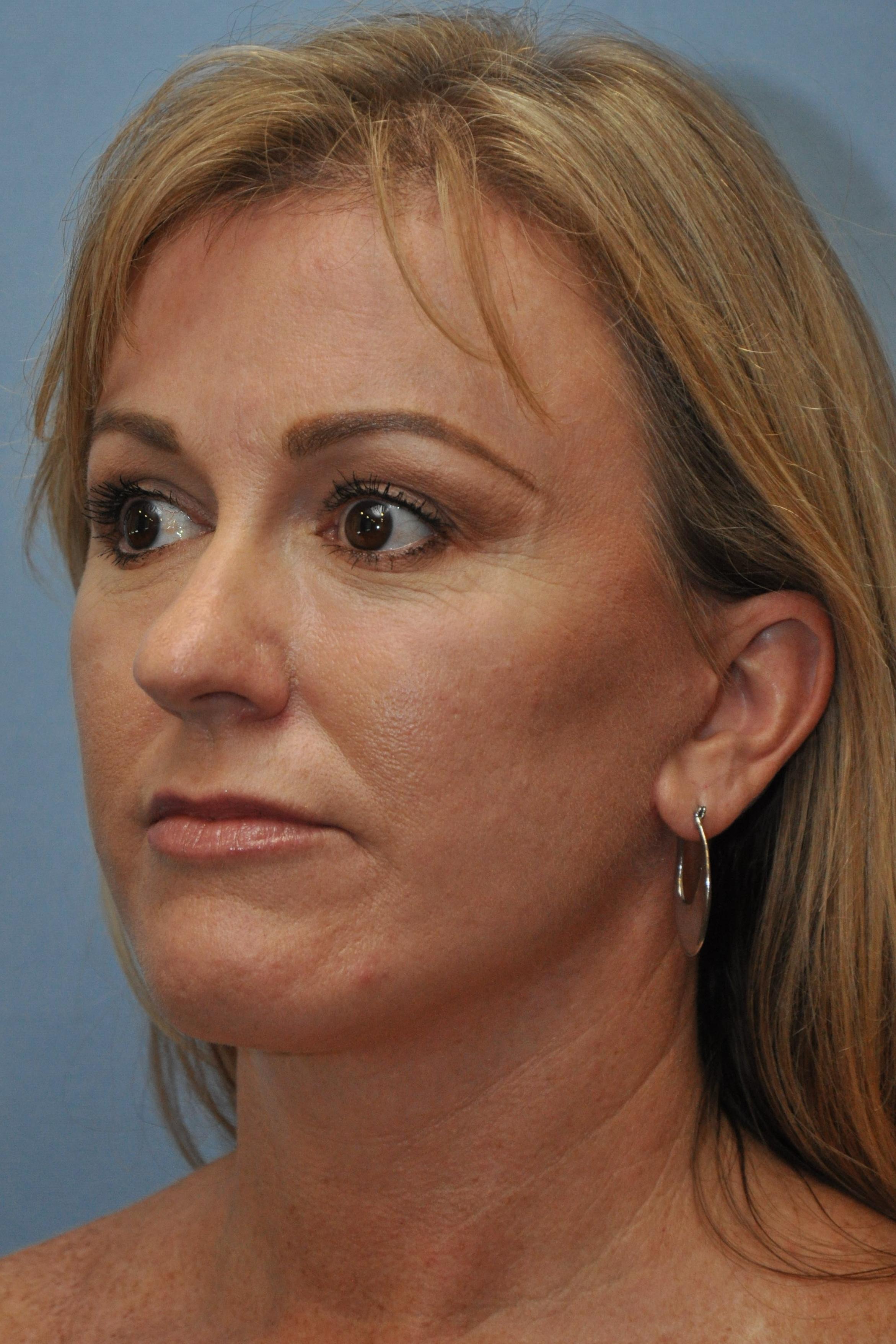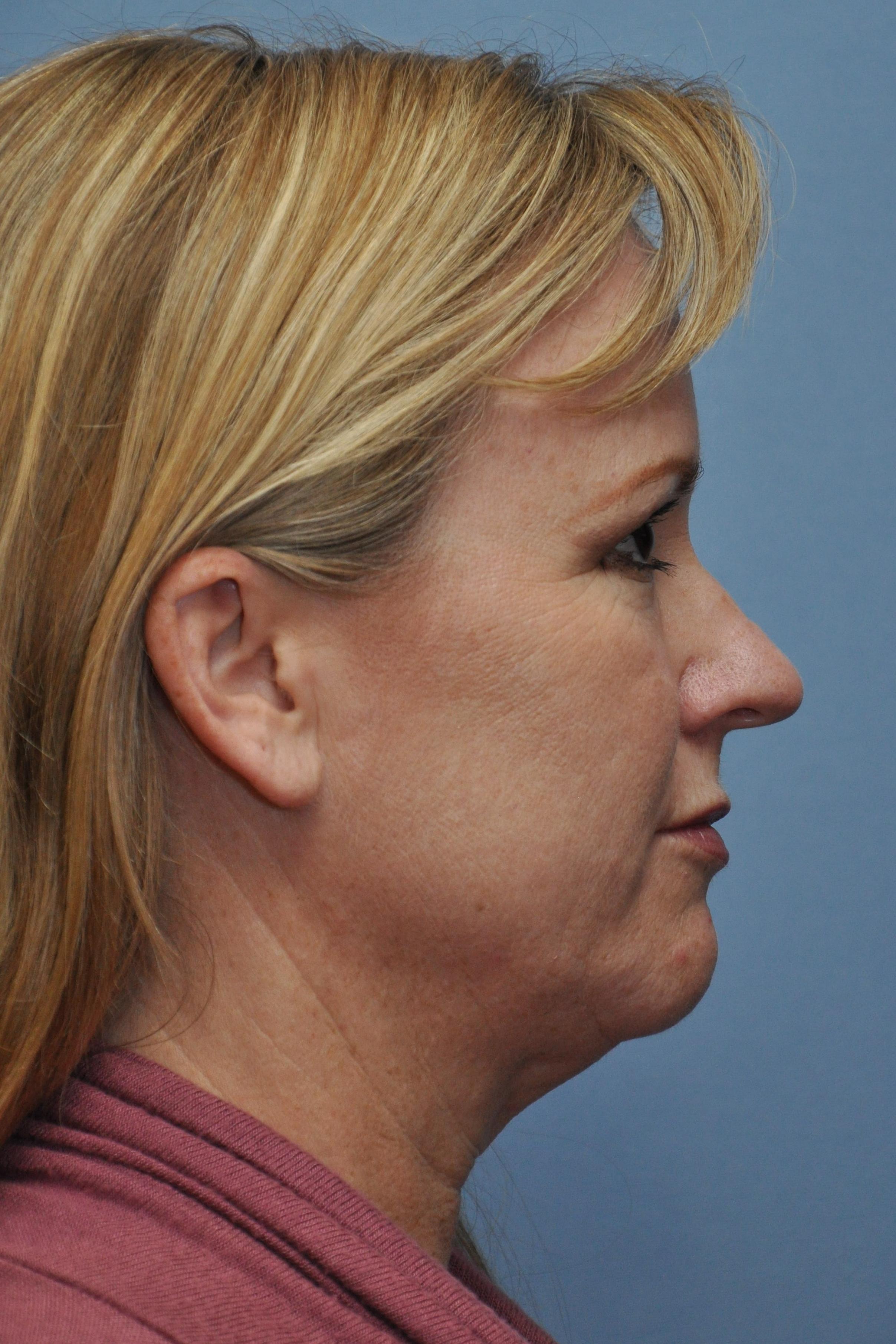 This lovely lady was able to achieve a refreshed appearance, recreating her feminine, slimmer jawline. We reversed the heaviness or square appearance that develops over time. The brows were lifted without shifting the hairline back, but instead shortening the length of the forehead. A facelift can look very natural without a plastic appearance.